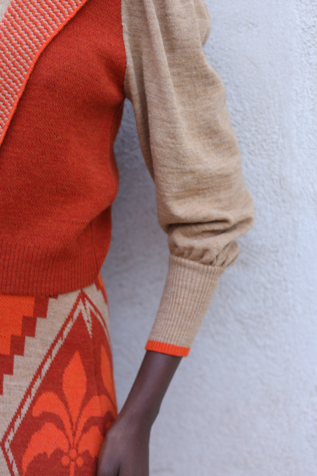 Jersey de punto en tono naranja intenso, con cuello redondo y un diseño estructurado que incorpora un detalle geométrico en forma de “V” en la parte delantera.