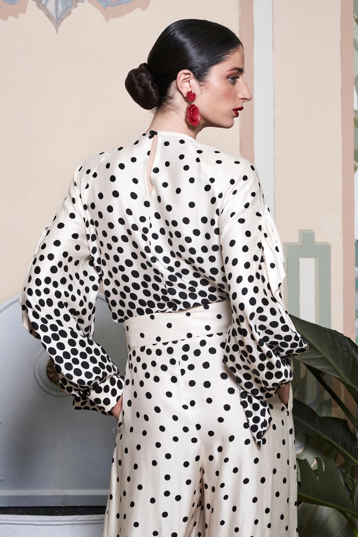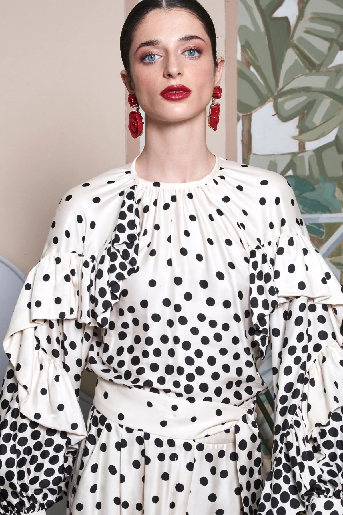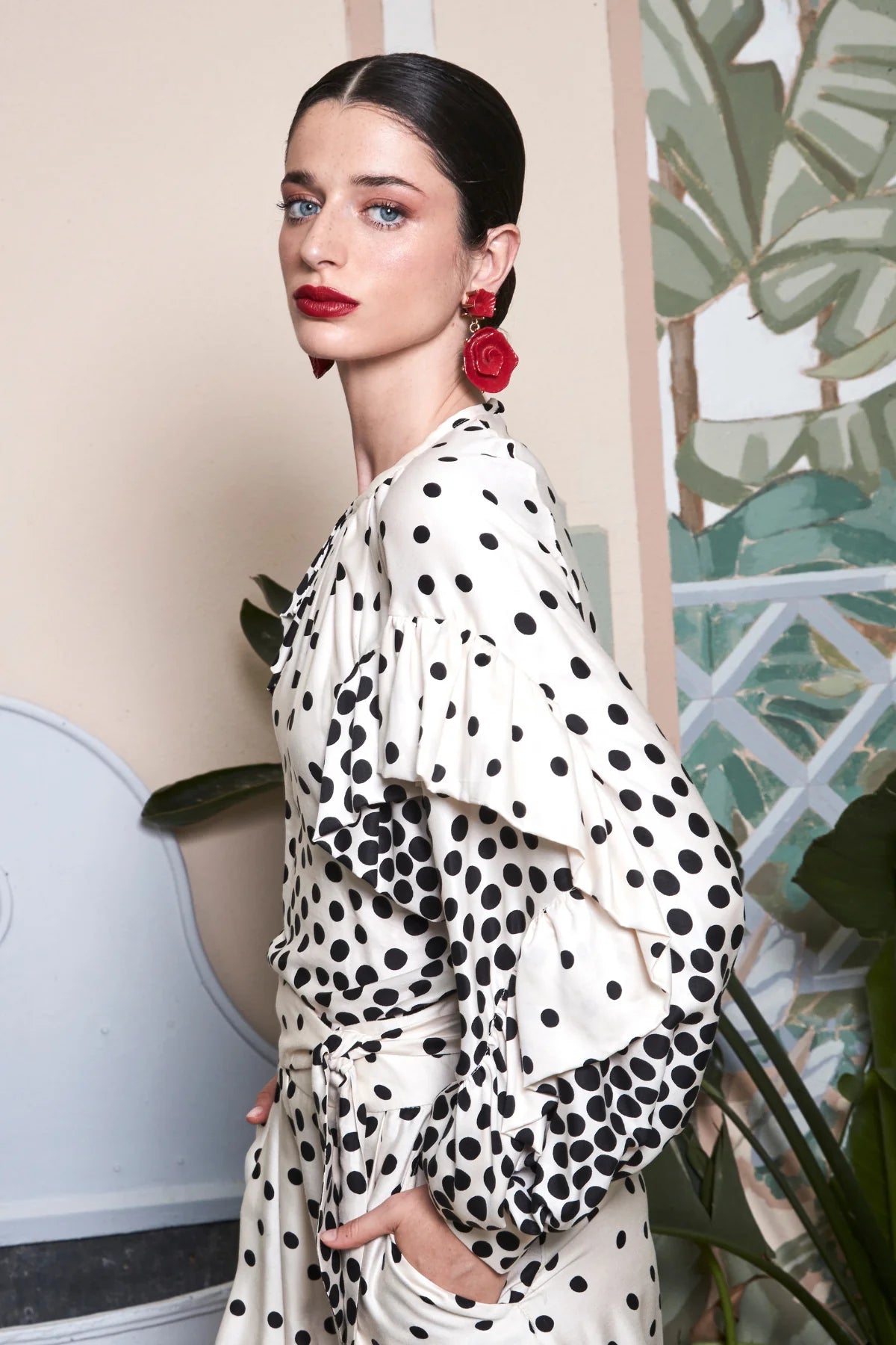 Vestido en tejido bordado floral en tonos coral, verde y beige. Cuerpo entallado con manga corta ligeramente estructurada y cintura marcada. Falda amplia con vuelo y detalle de volante que aporta movimiento. Cierre mediante cremallera invisible.