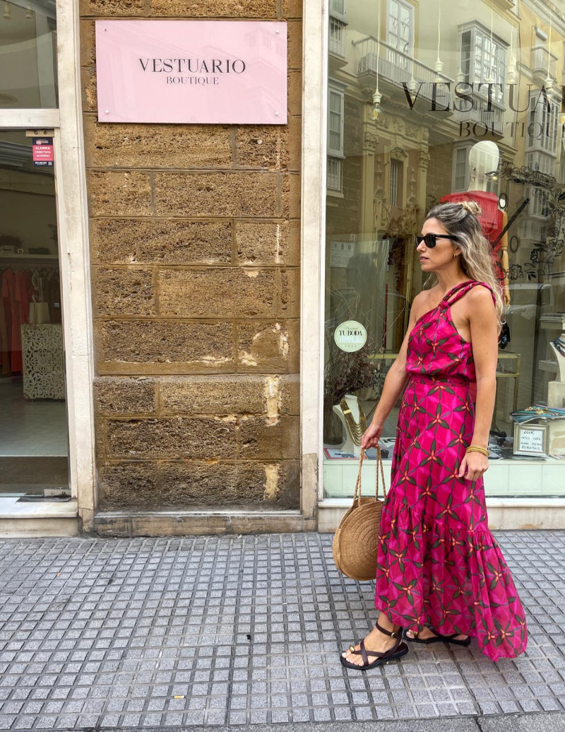 Conjunto de dos piezas formado por un top de escote Halter asimétrico y falda pareo, con detalle de volante para crear movimiento. El estampado en tonos fucsia y verdes con temática floral y el tejido vaporoso, hace de este conjunto un opción ideal para un día de verano.