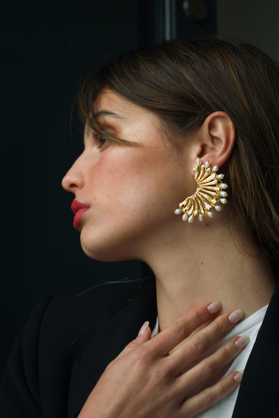 La combinación de los tonos dorados y blancos de esta joya le dan un toque de lujo y distinción a cualquier conjunto. Joyería acabada a mano, bañados en oro de cuarto de micra de 24 kilates. Son únicos y especiales.
