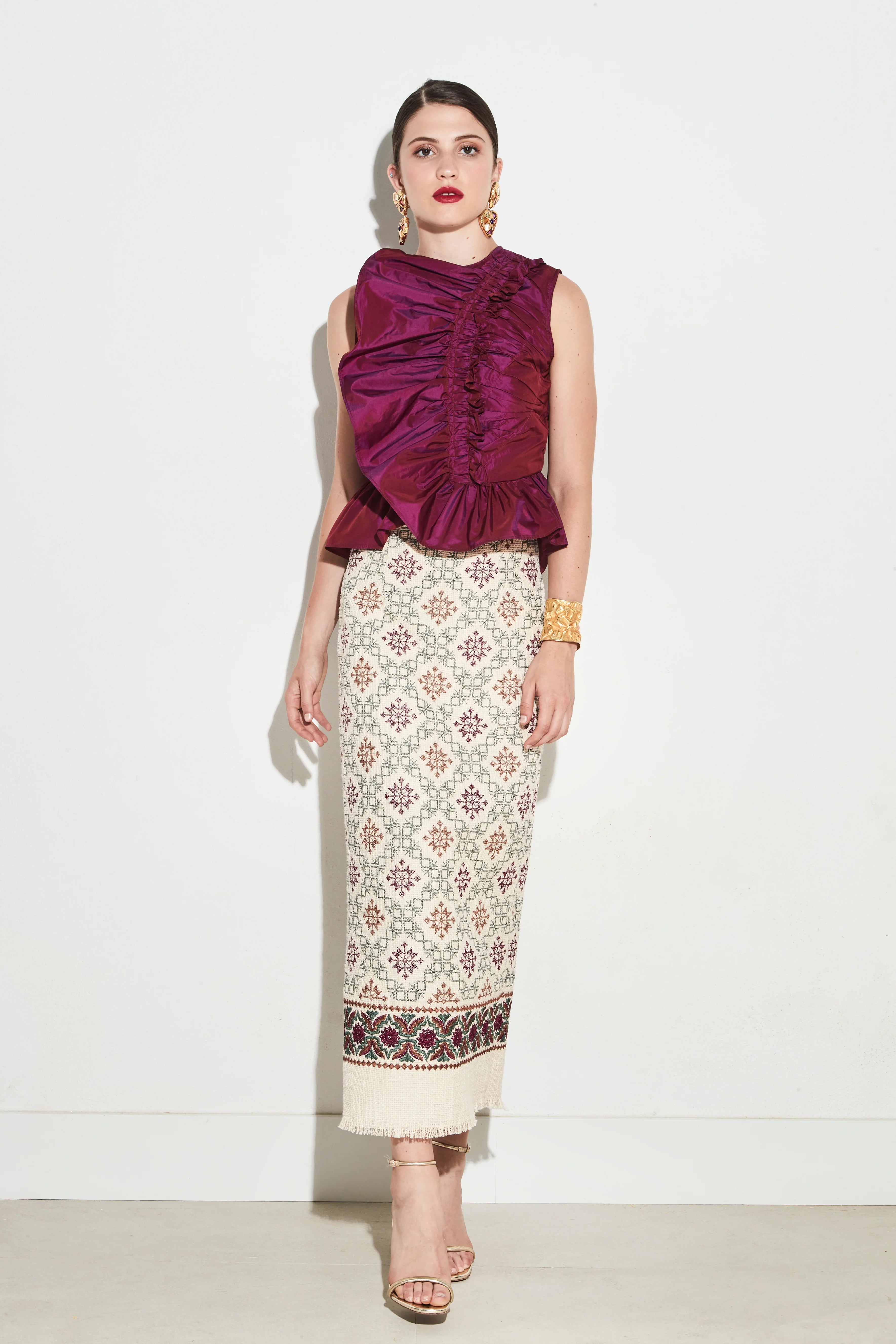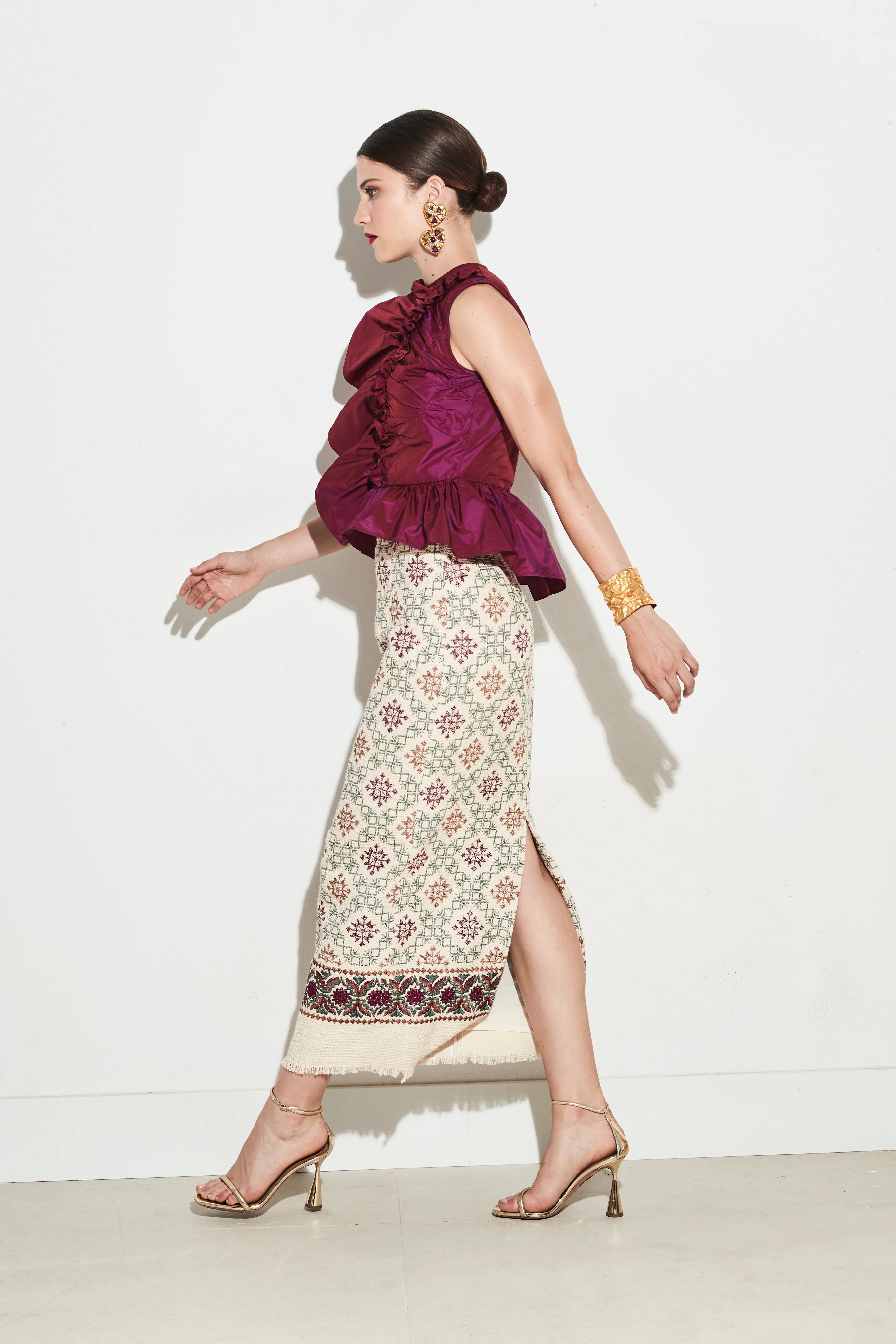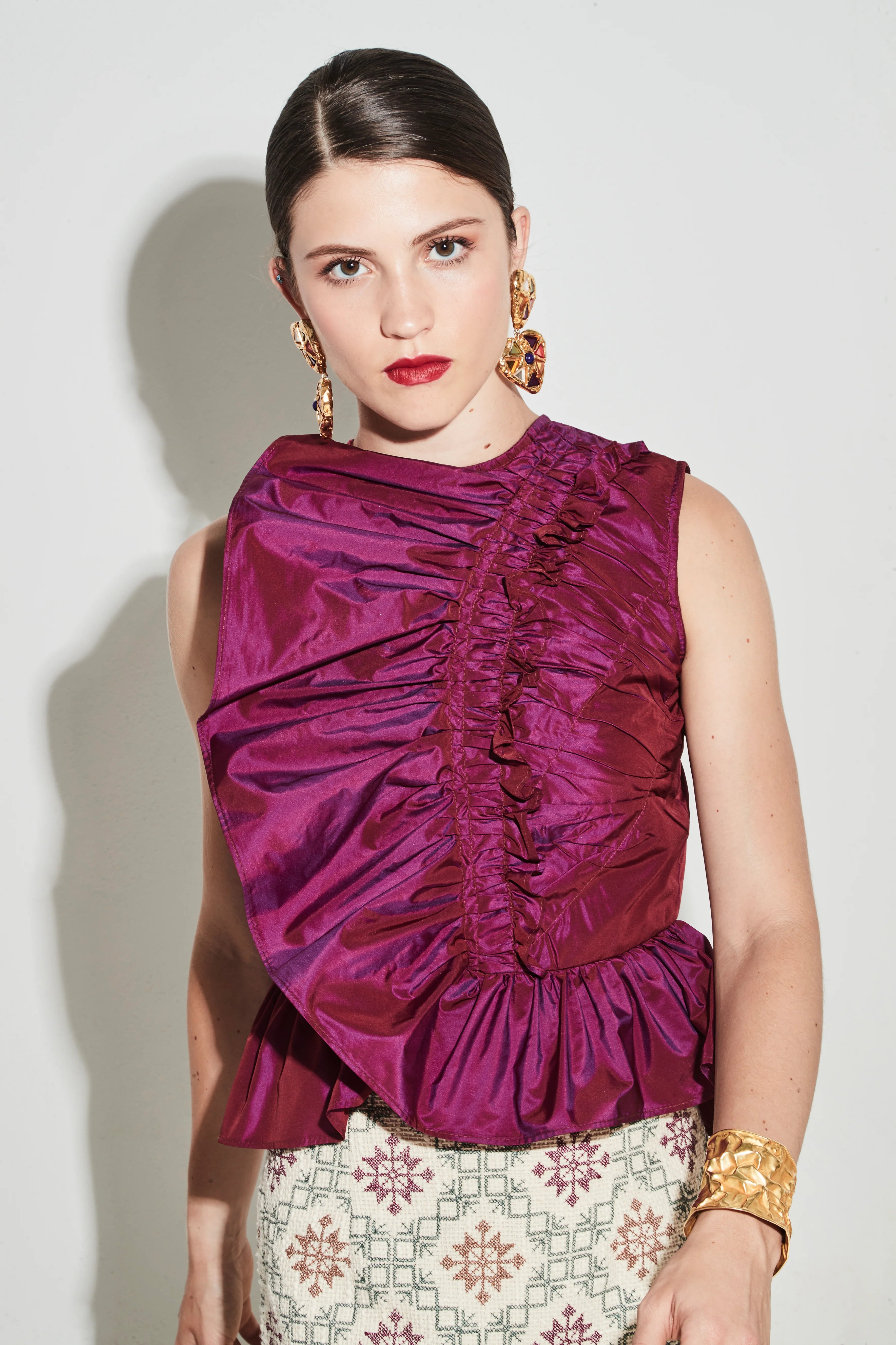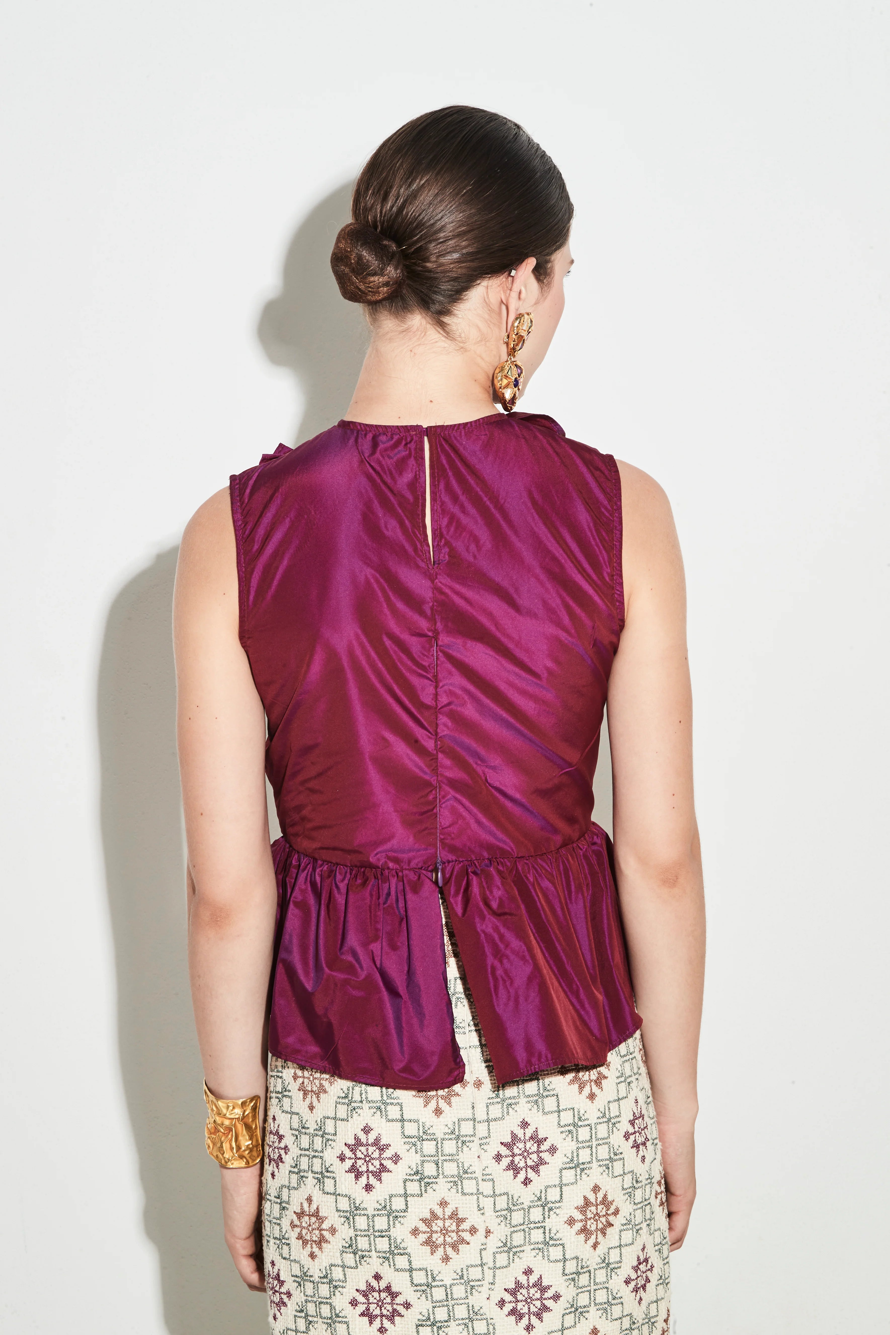 Camisa burdeos de tafetán sin mangas con escote cerrado. Destaca por su volante delantero y caída en vuelo que aporta volumen. Cierre mediante cremallera invisible.