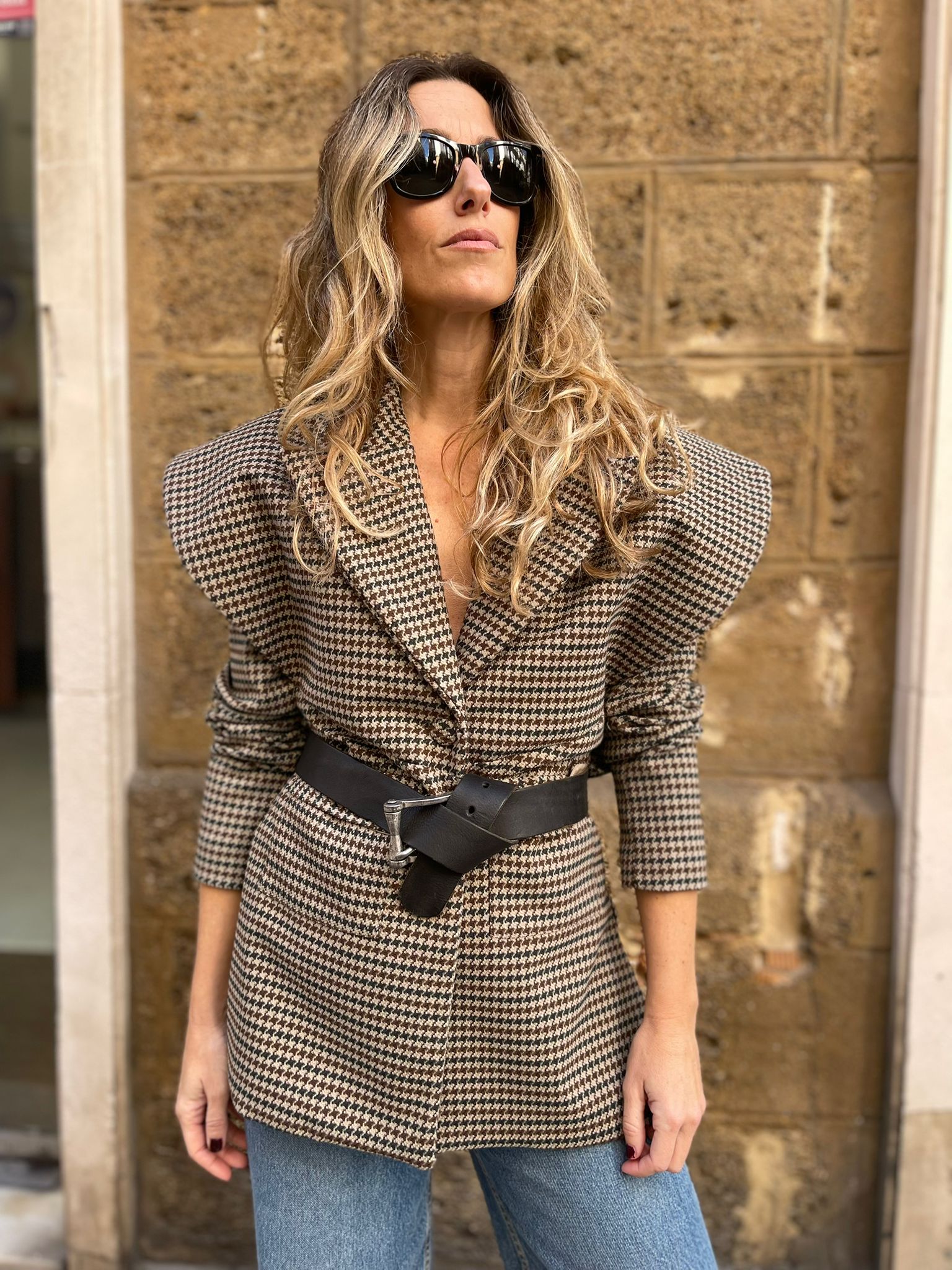 Prenda icónica que redefine la elegancia con un diseño estructurado y hombros marcados. Confeccionada en un sofisticado tejido de cuadros marrones, esta americana destaca por su solapa XL y ajuste entallado en la cintura, que realza la silueta femenina con un aire moderno y vanguardista.