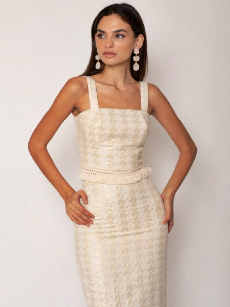 Conjunto de top, chaqueta y falda midi. El top es de tirantas con unos acabados en la parte inferior de flecos. La chaqueta es de manga larga con hombreras y acabado en la misma pasamanería de flecos, al igual que el top. Por otro lado, se encuentra la falda que tiene una abertura en la parte trasera. El estampado en una sutil pata de gallo maxi y con un ligero brillo de damasco, aporta la nota original en este 3 piezas.