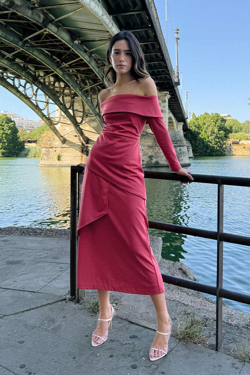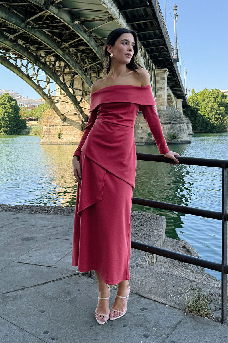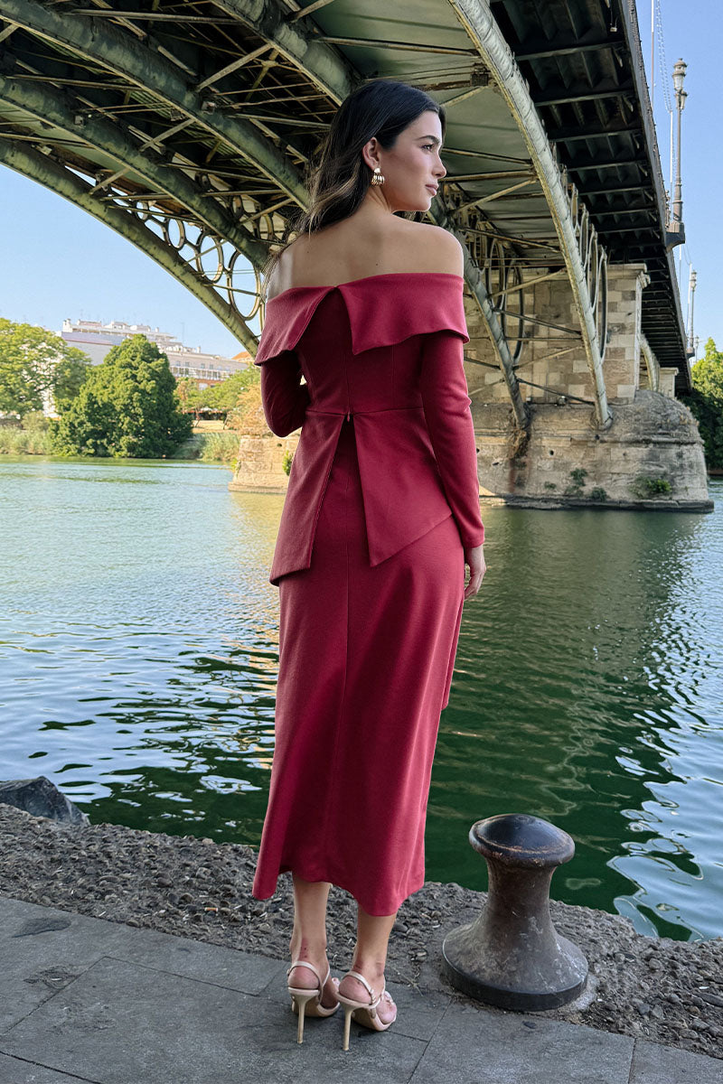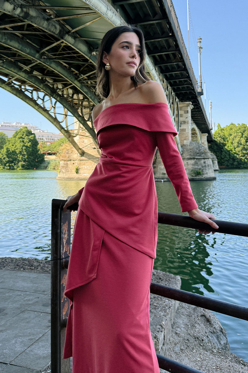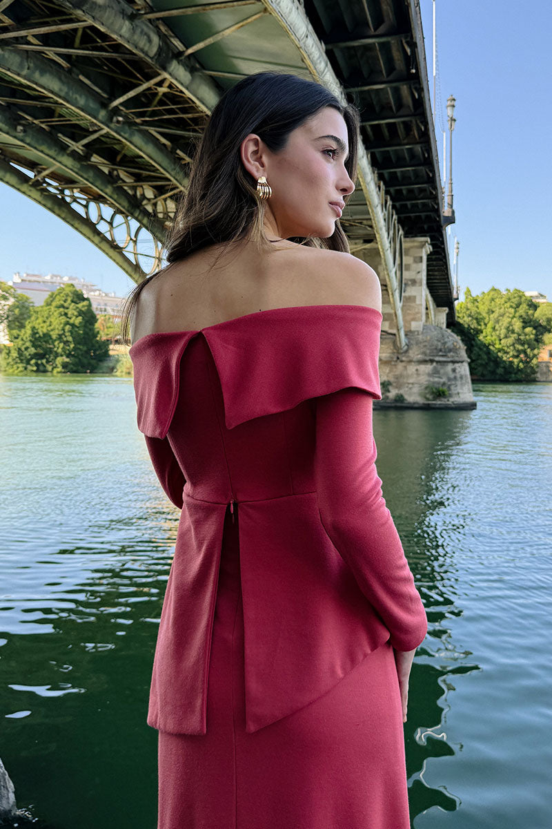 Conjunto de dos piezas de top con escote barco, sutil corte en la cintura y peplum. Manga francesa.  Tiene cremallera trasera.  La falda es evasé de corte midi y  detalle en el lateral dándole un toque de movimiento. Un conjunto sofisticado y elegante, cuya tonalidad, en rosa viejo, es súper favorecedora.