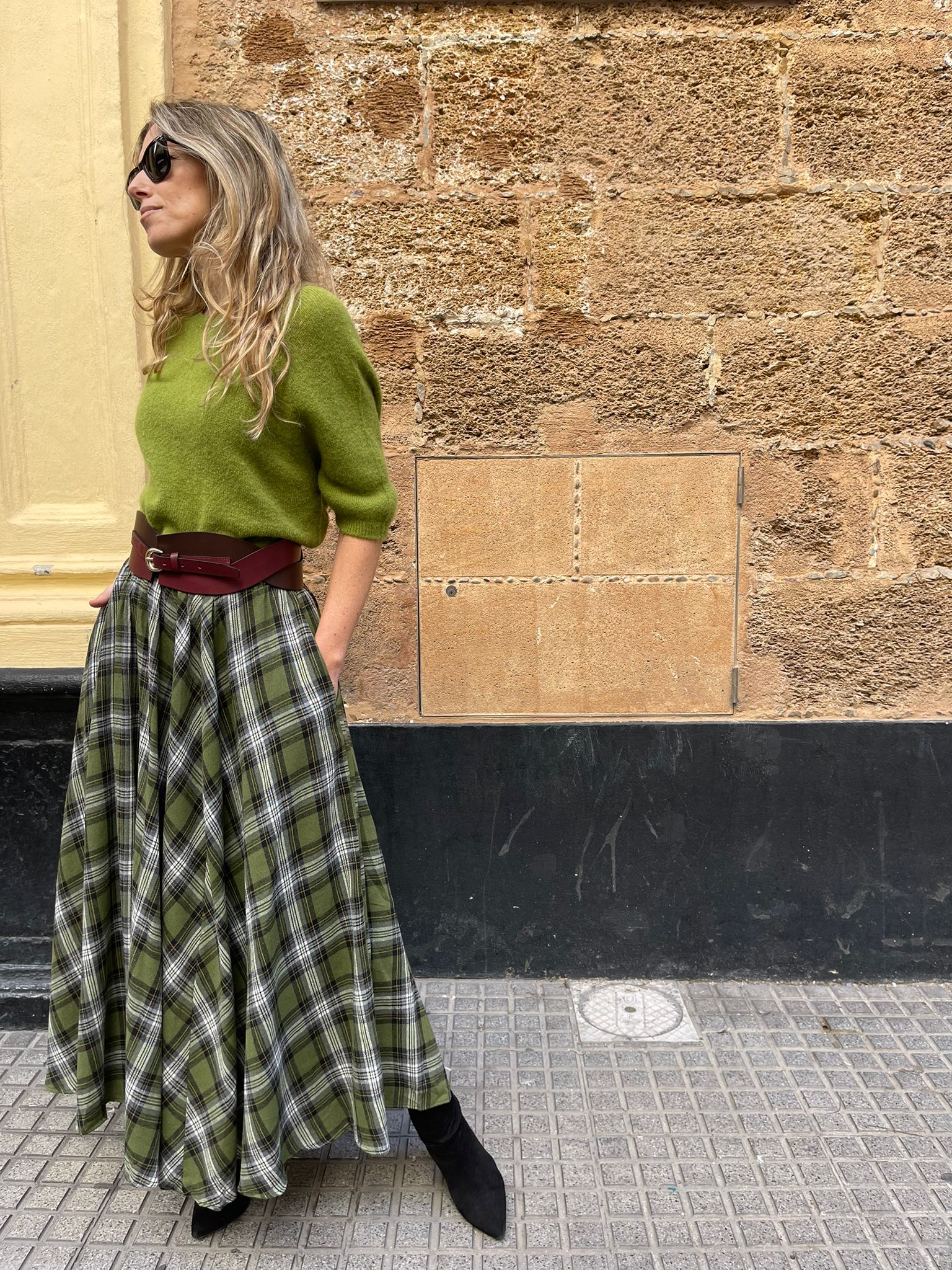 Especial, midi y con vuelo! La falda ideal para tus look con más movimiento! Cinturilla elástica, bolsillos y el estampado tendencia de esta temporada. El color verde musgo a contraste con varias tonalidades es el plus de esta preciosa falda.