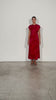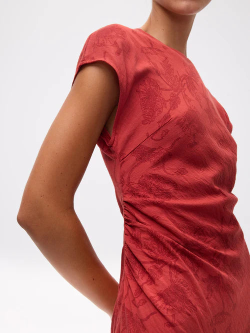 Su cuello redondo y manga corta japonesa crean una silueta suave y favorecedora, mientras que el drapeado en un lado de la cintura estiliza la figura con sutileza. La falda con vuelo y acabado en corte al bies aporta caída y movimiento natural en cada paso, realzando su encanto.