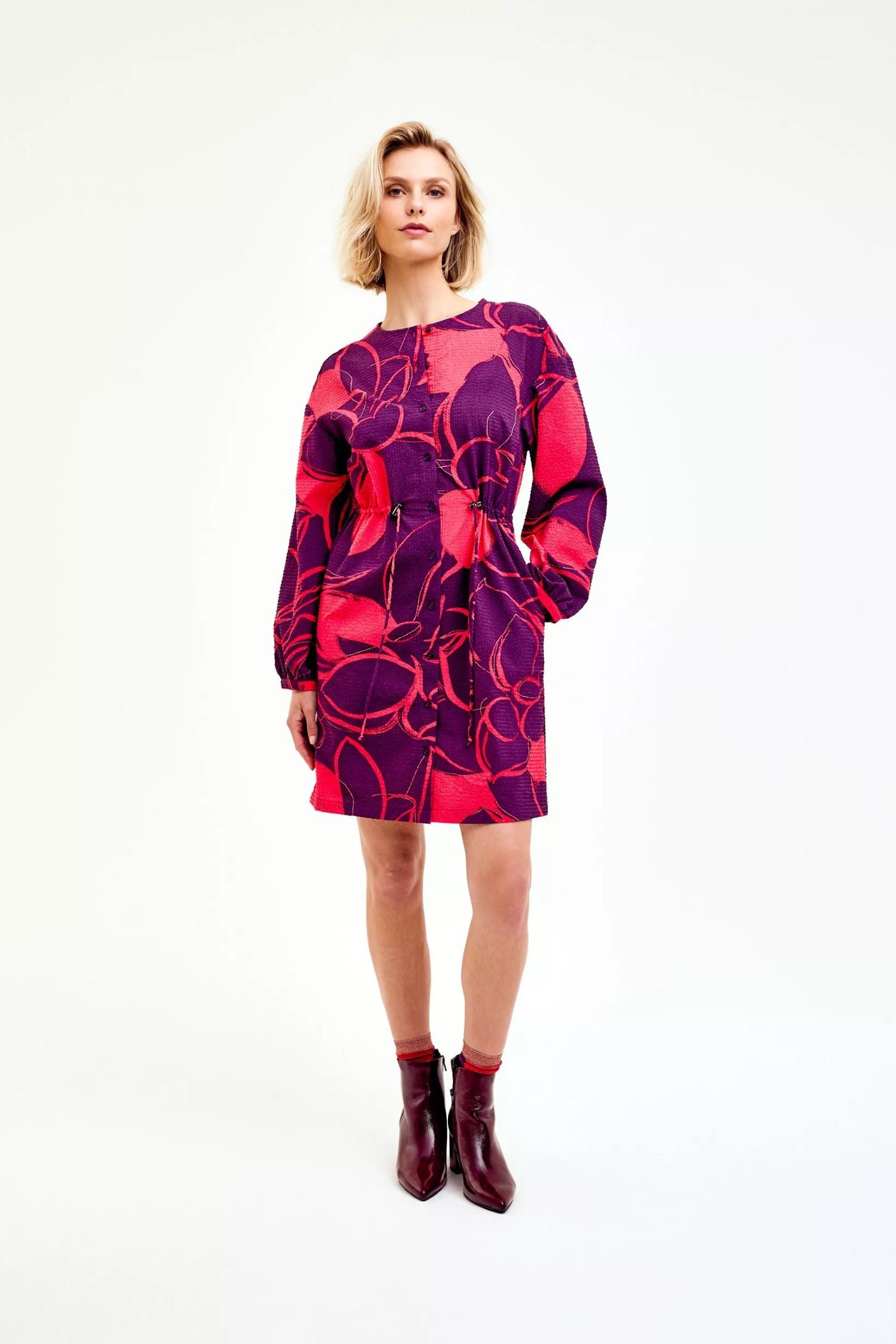 Vestido corto de mujer con mangas largas. Este vestido de color morado oscuro presenta un estampado de flor de loto ampliado dibujado a mano en un tono rosa contrastante. Diseñado con cuello redondo, botones y cordón para enfatizar tu cintura.