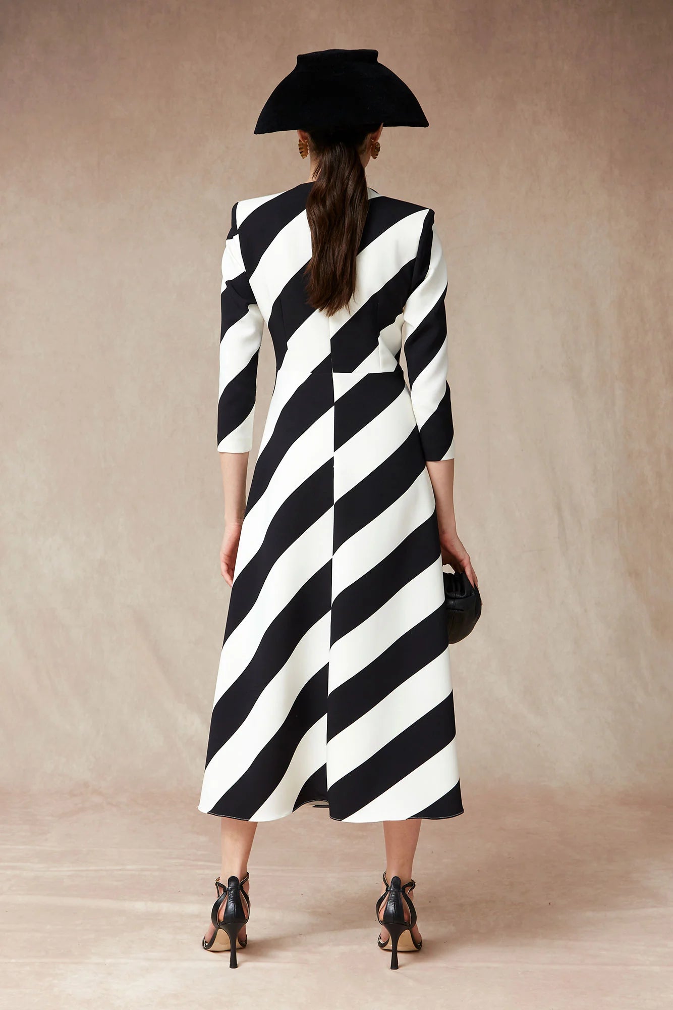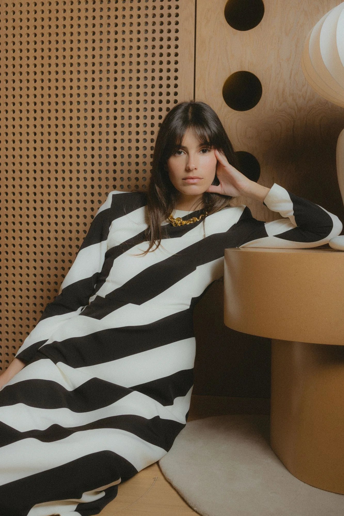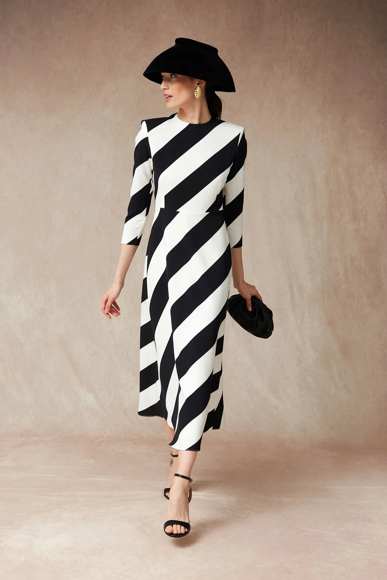 Este vestido midi de rayas blancas y negras es la definición de elegancia atemporal. Su diseño de rayas diagonales estiliza la silueta y aporta un efecto visual sofisticado, ideal tanto para eventos especiales como para looks de invitada o ocasiones más formales.