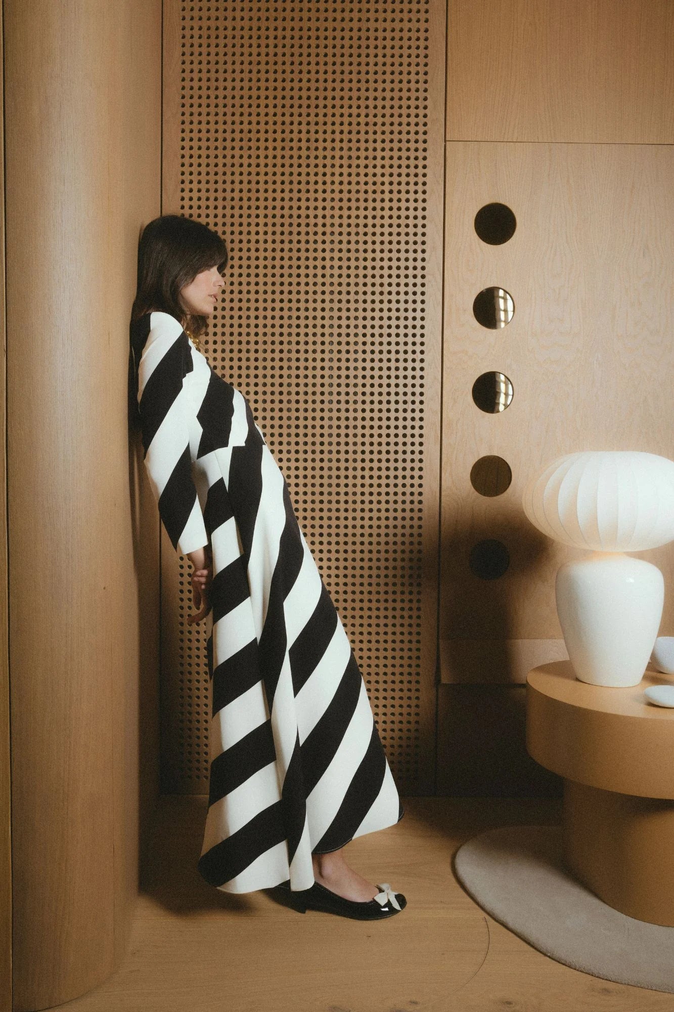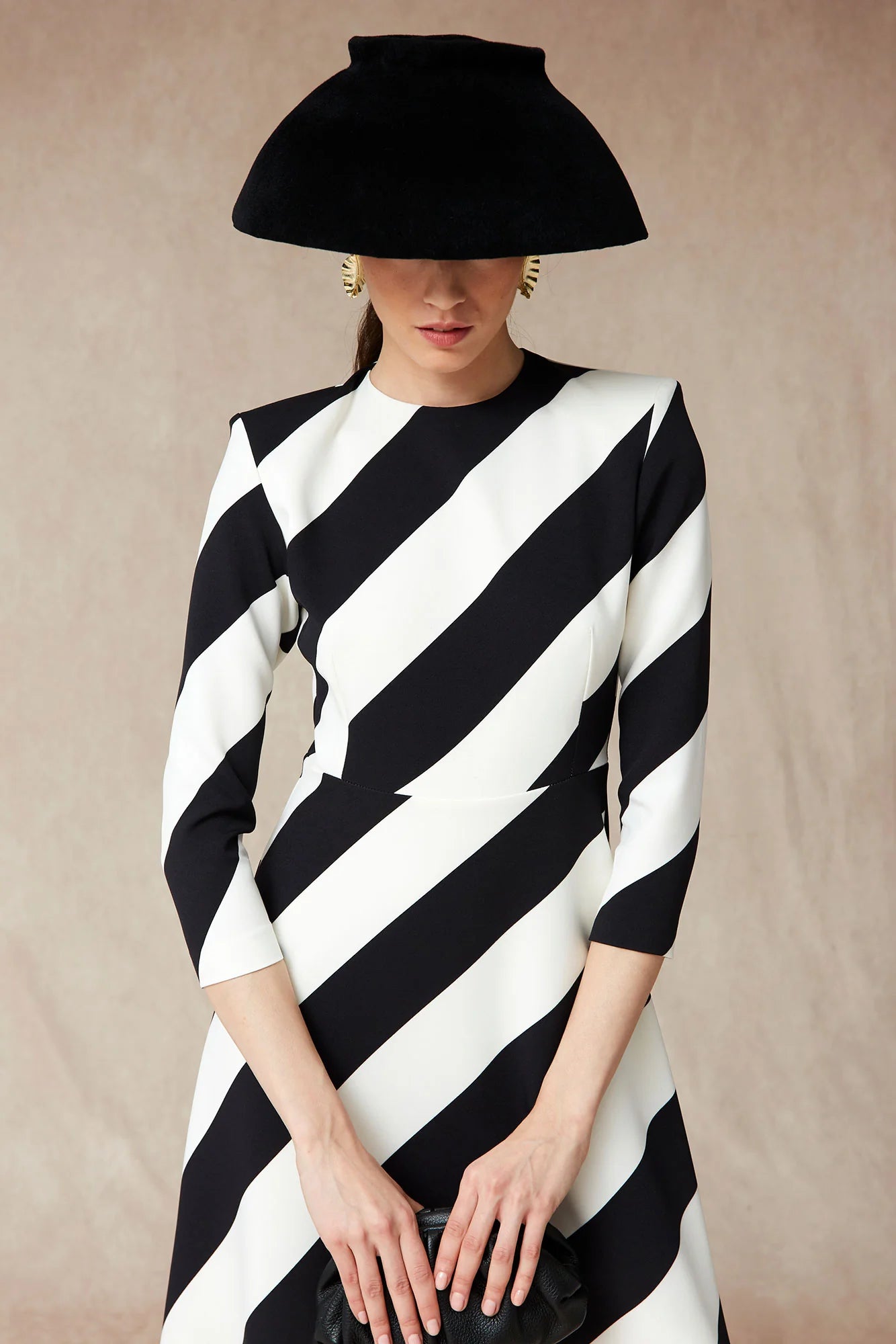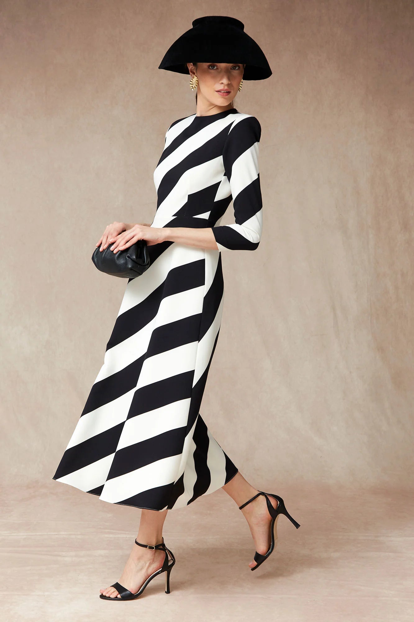 Este vestido midi de rayas blancas y negras es la definición de elegancia atemporal. Su diseño de rayas diagonales estiliza la silueta y aporta un efecto visual sofisticado, ideal tanto para eventos especiales como para looks de invitada o ocasiones más formales.
