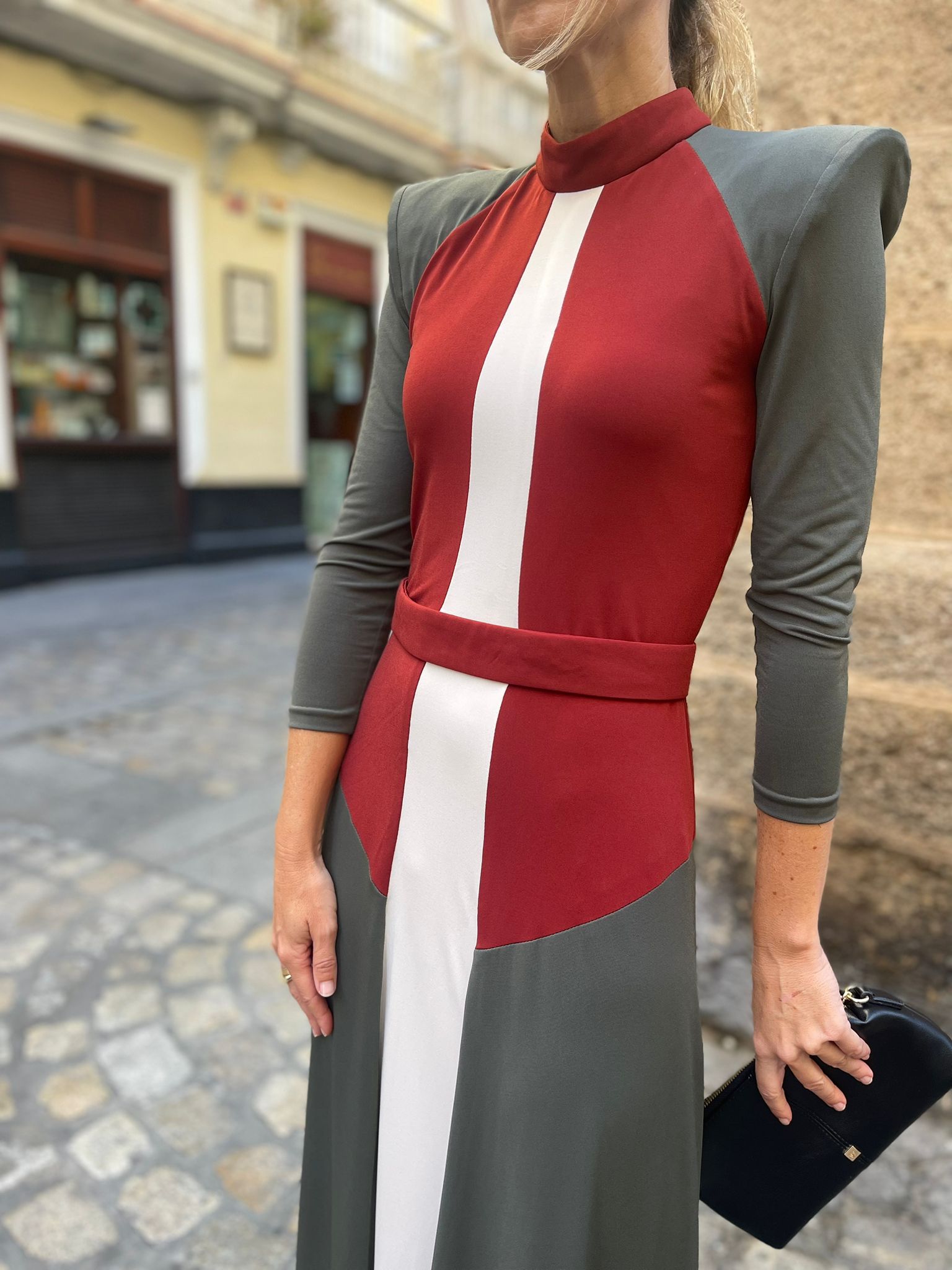Vestido largo en punto en tonos khaki, con diseño tricolor y escote redondo. La combinación de colores en bloques verticales alarga visualmente la figura. Su corte fluido y sin mangas lo convierte en una opción versátil para eventos de día o reuniones formales. Diseñado y fabricado en España.