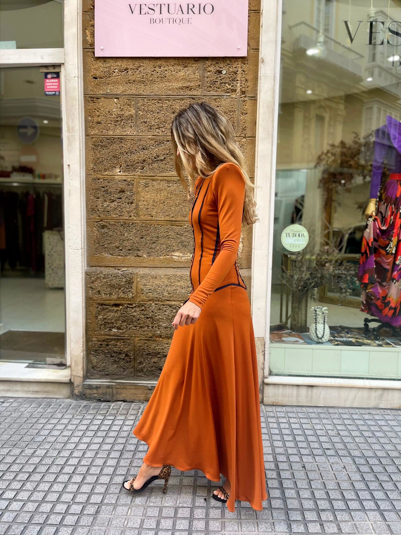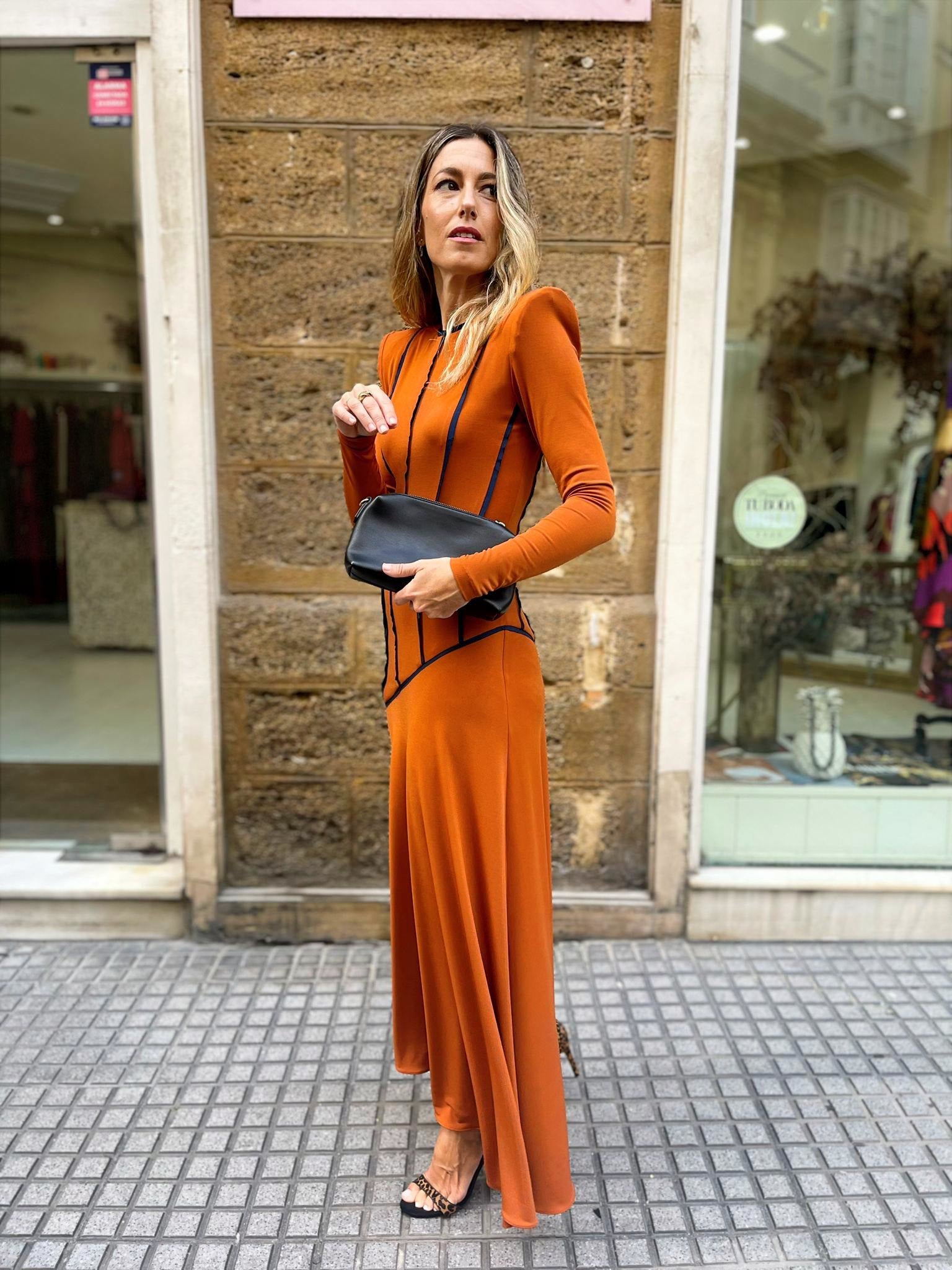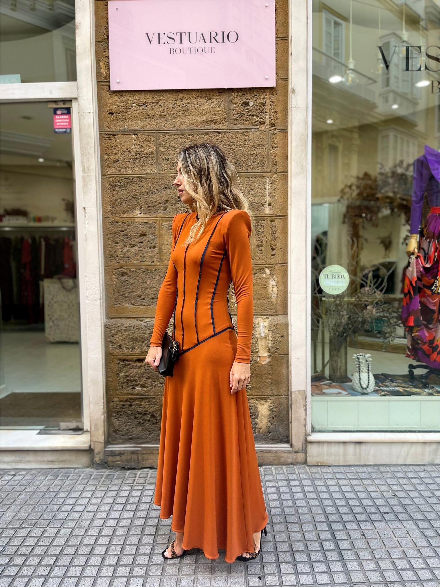 Vestido largo confeccionado en tejido de punto de seda, de manga larga, con escote redondo y corte recto Su silueta sencilla se eleva gracias a la textura del tejido que se ajusta al cuerpo creando un efecto corsé gracias a las costuras verticales en tono a contraste, lo que estiliza la figura y marca la silueta. La falda es de vuelo amplio y bajo irregular para aportarle más movimiento al caminar.