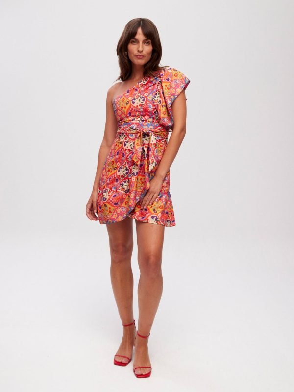 Vestido corto y de escote asimétrico con volantito. El estampado geométrico y multicolor del tejido es su detalle más original. Cuenta con un fajín opcional para una lazada en la cintura.